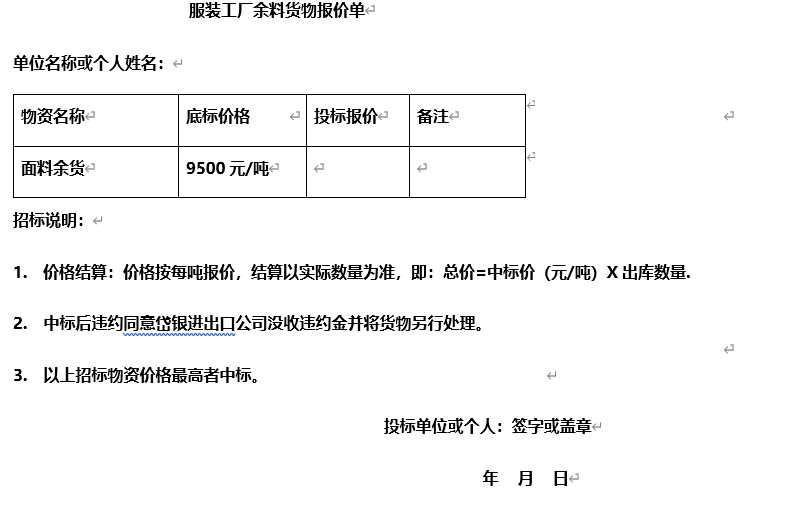 1.根据当前市场行情及面料的质量情况,本次处理的面料处理底标价格为9500元/吨,投标价必须高于或等于底价,否则无效!