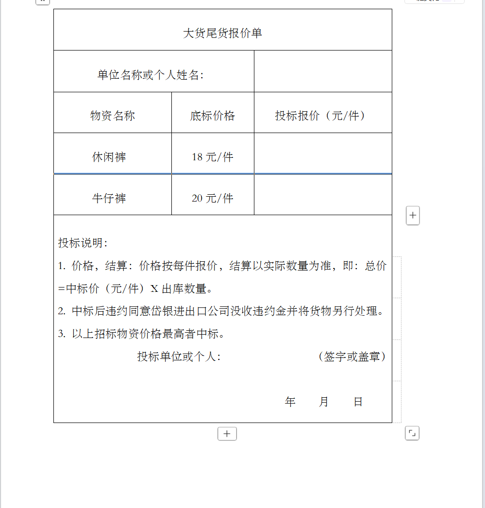 1.根据当前市场行情及服装的质量情况,投标价必须高于底价,否则无效!